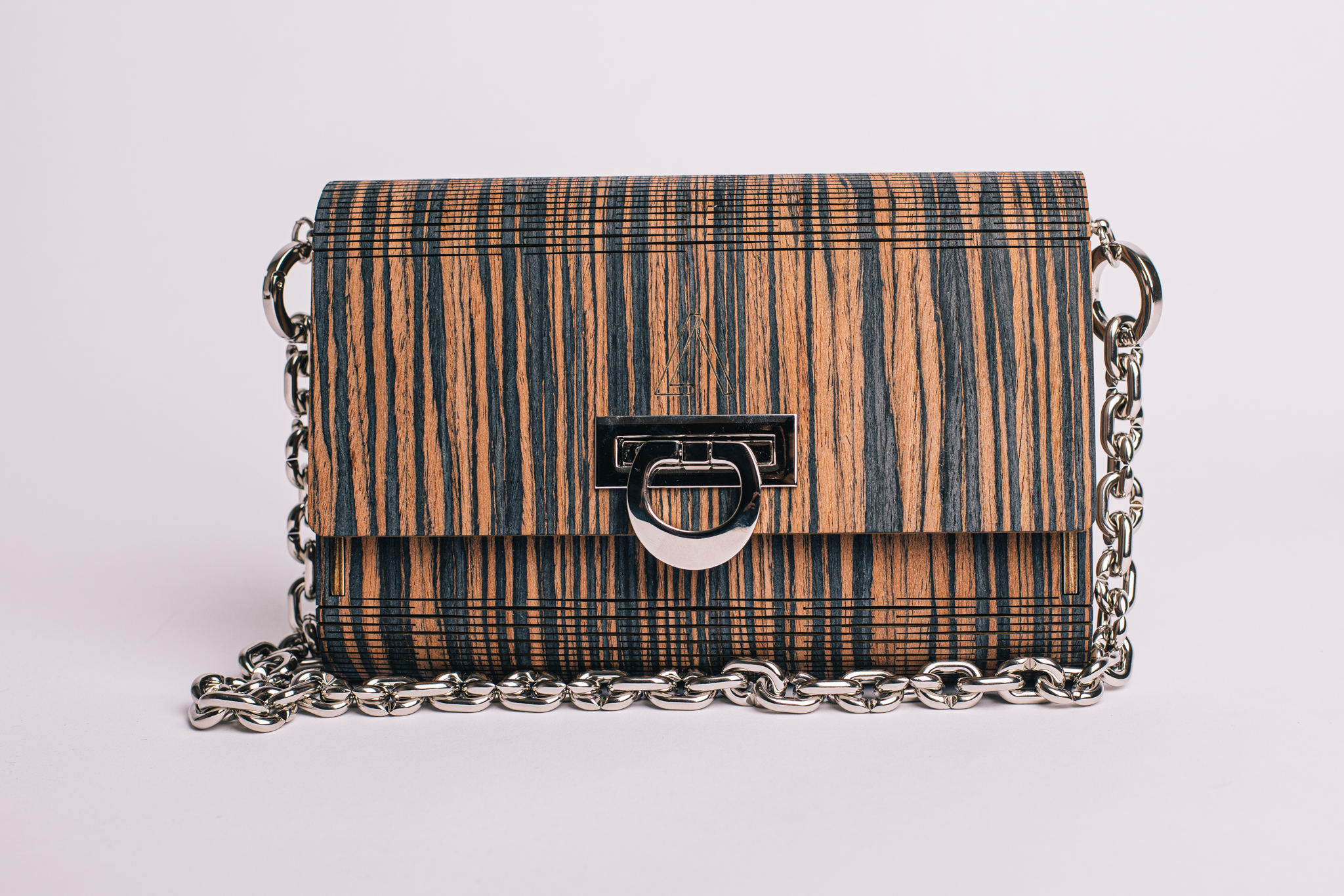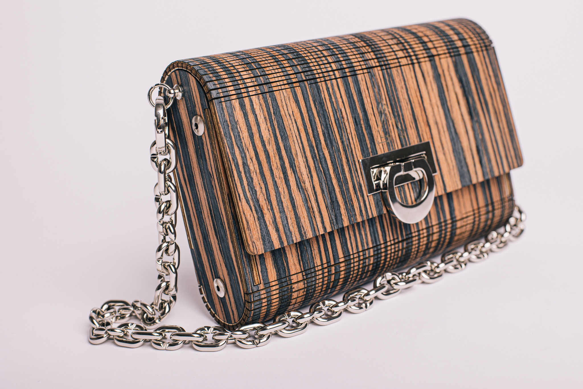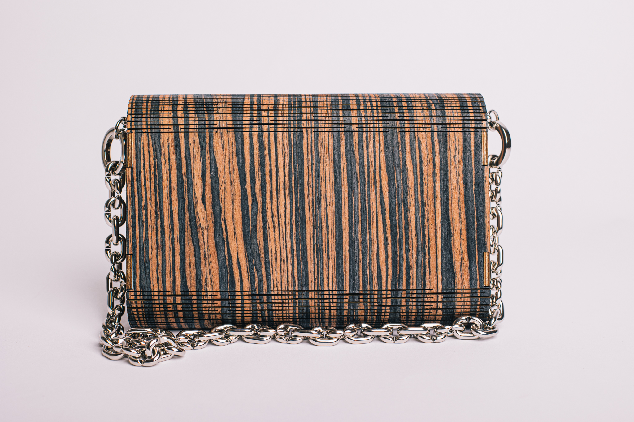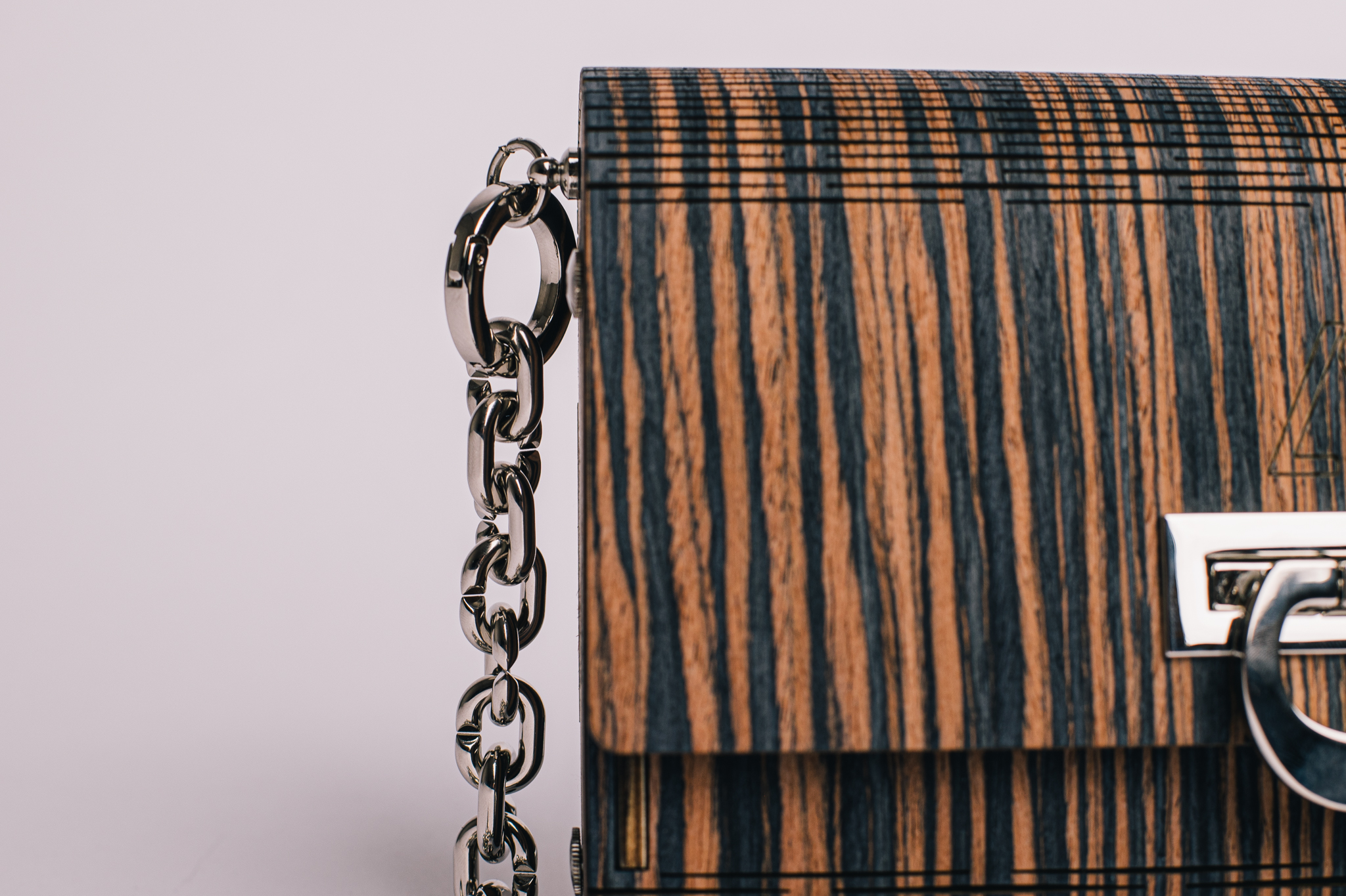 Tutta la scocca e il rivestimento esterno è realizzato in legno, ciò conferisce leggerezza, resistenza e rigidità alla borsa. Un dettaglio importante sono i tagli visibili che permettono di realizzare le parti curve della borsa.