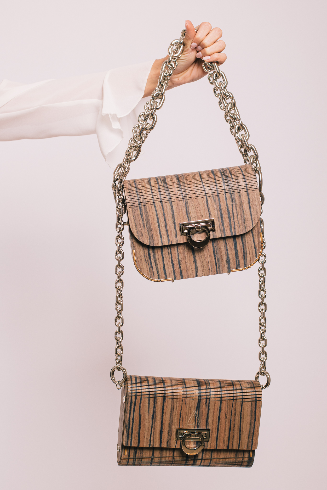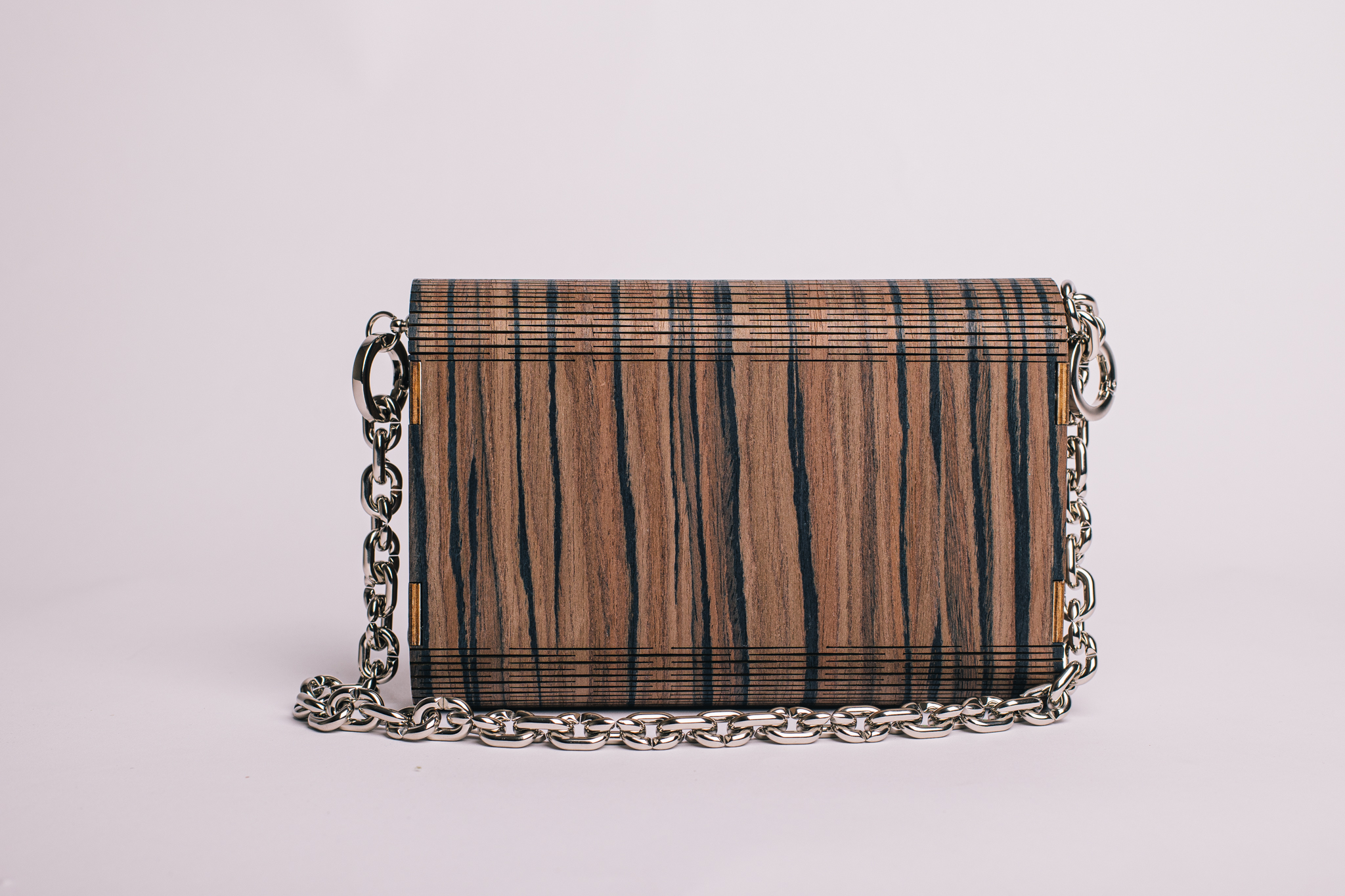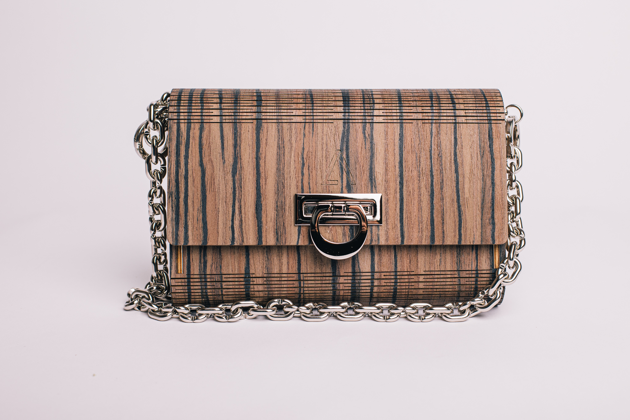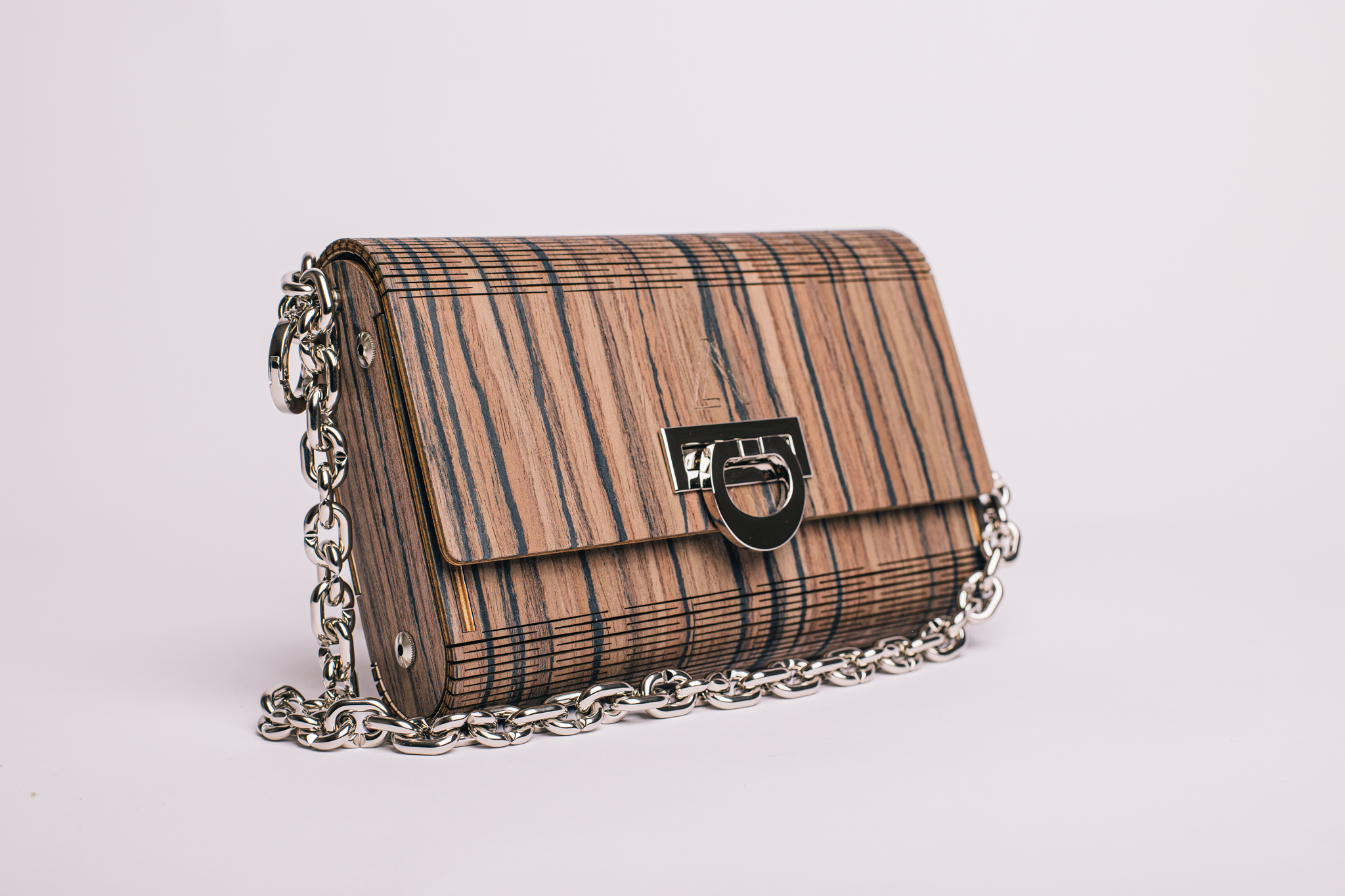 Tutta la scocca e il rivestimento esterno è realizzato in legno, ciò conferisce leggerezza, resistenza e rigidità alla borsa. Un dettaglio importante sono i tagli visibili che permettono di realizzare le parti curve della borsa.