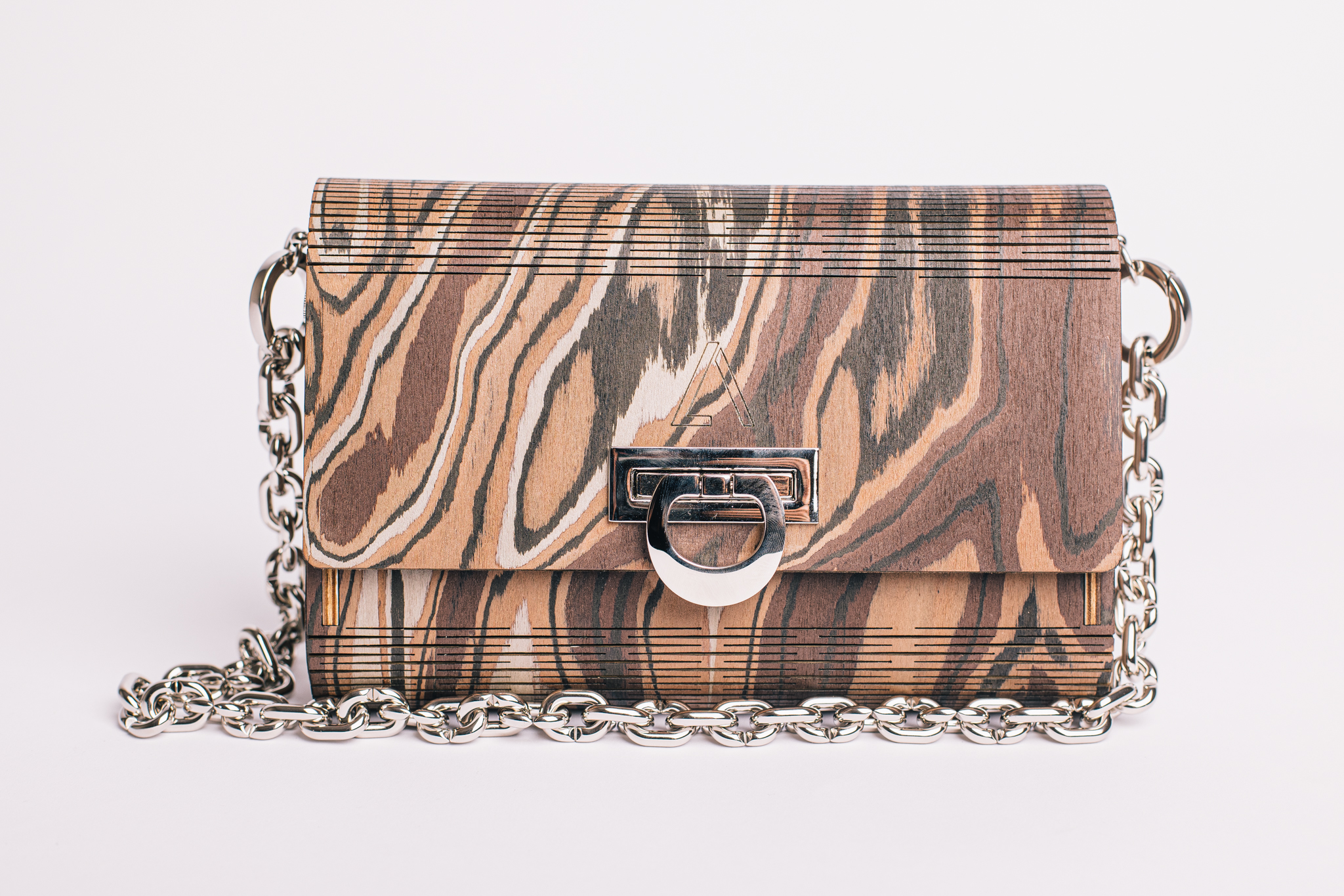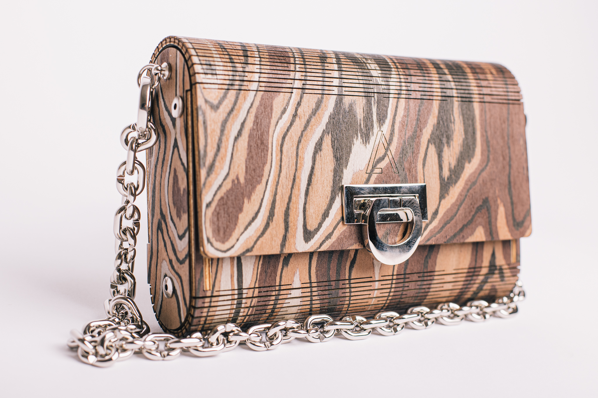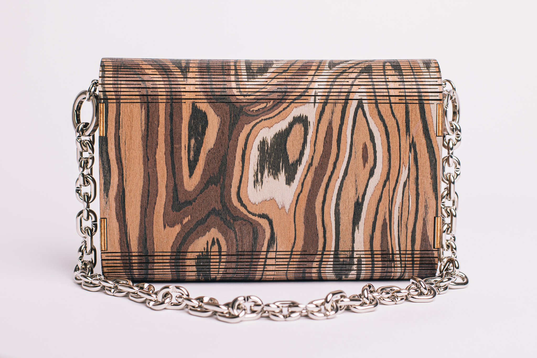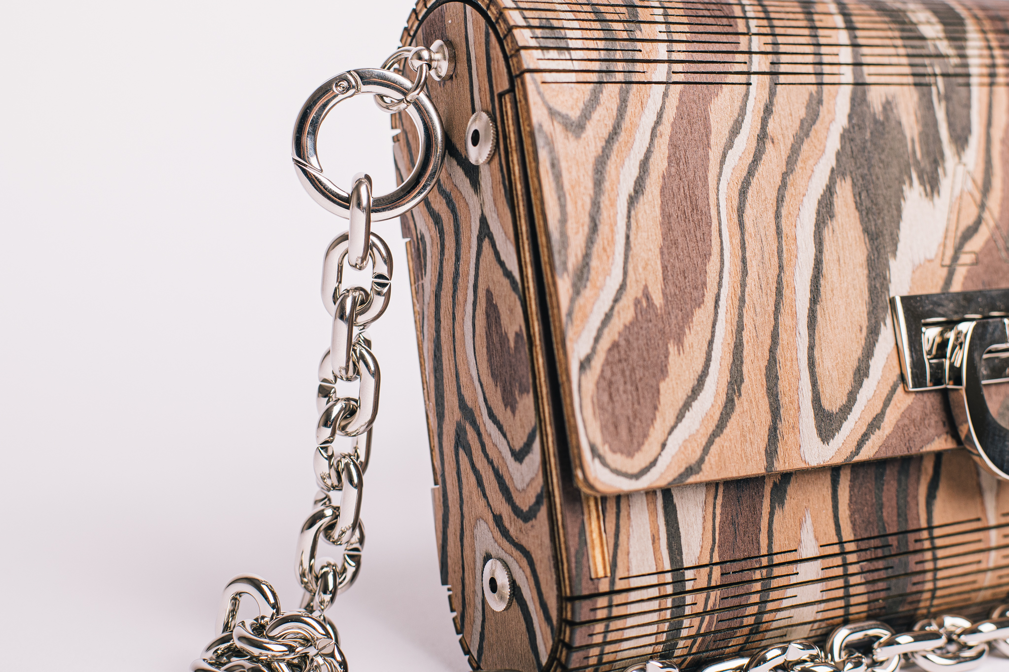 Tutta la scocca e il rivestimento esterno รจ realizzato in legno, ciรฒ conferisce leggerezza, resistenza e rigiditร  alla borsa. Un dettaglio importante sono i tagli visibili che permettono di realizzare le parti curve della borsa.