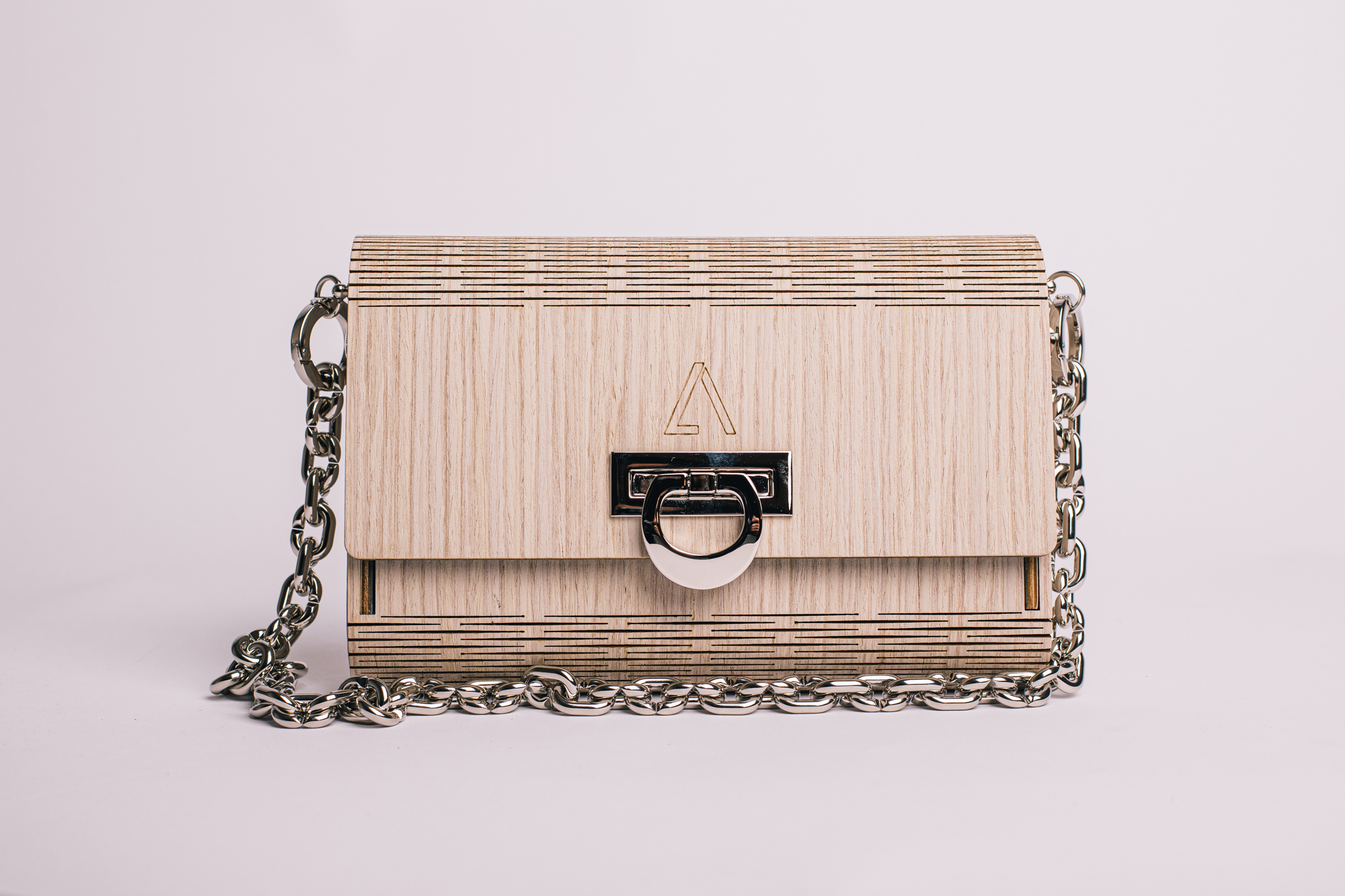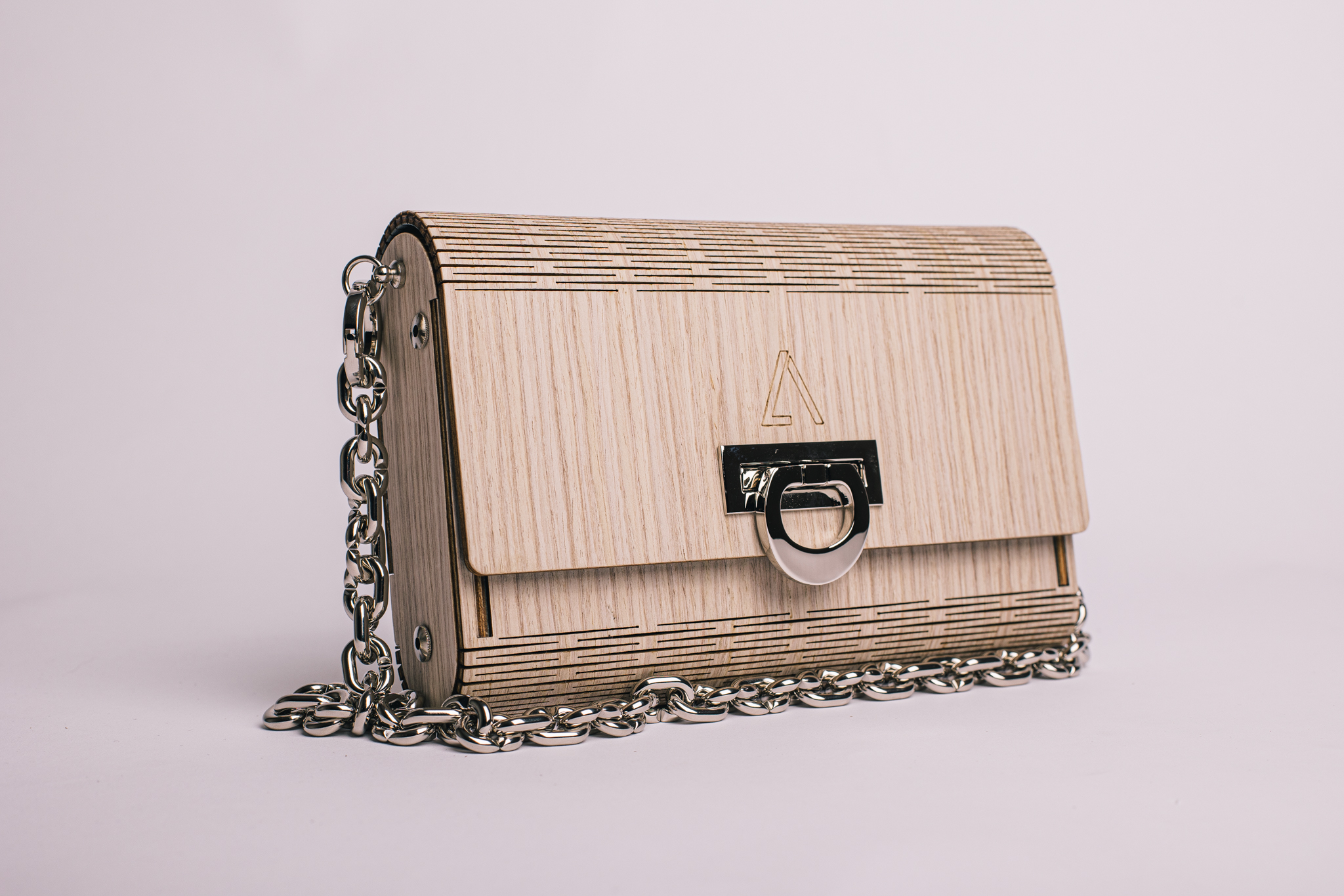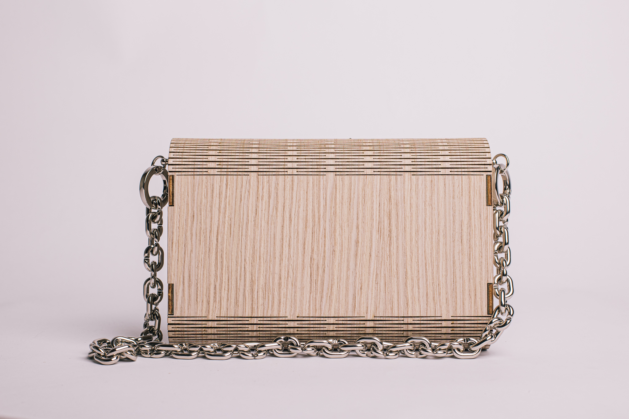 Tutta la scocca e il rivestimento esterno รจ realizzato in legno, ciรฒ conferisce leggerezza, resistenza e rigiditร  alla borsa. Un dettaglio importante sono i tagli visibili che permettono di realizzare le parti curve della borsa.