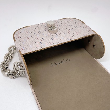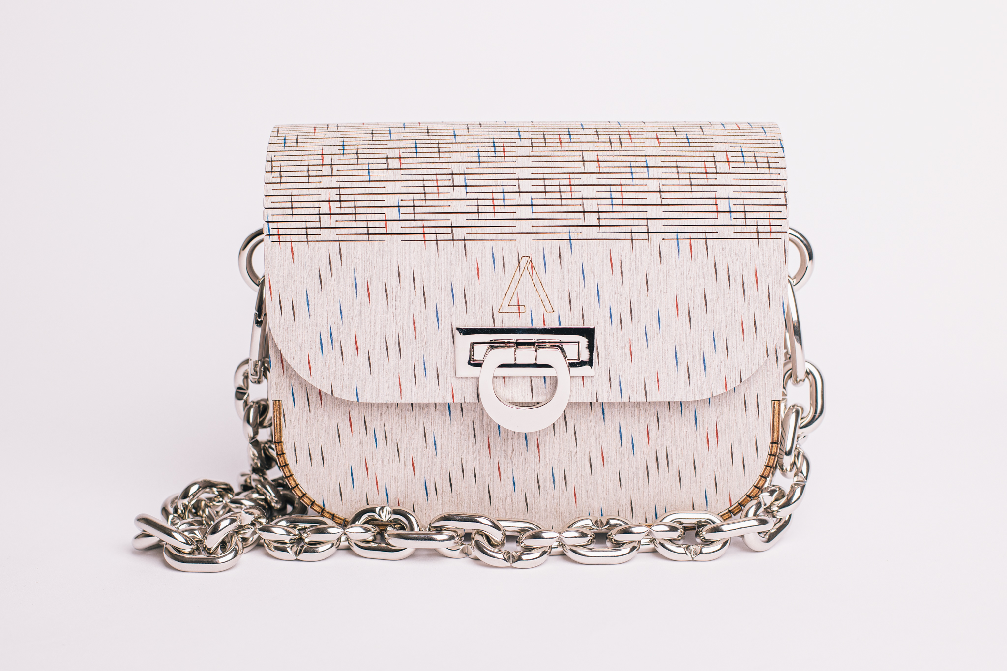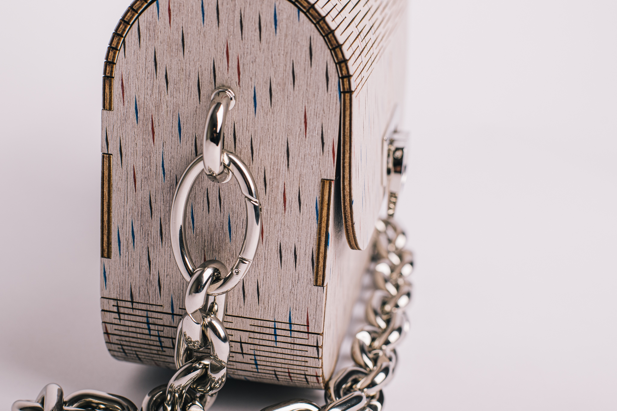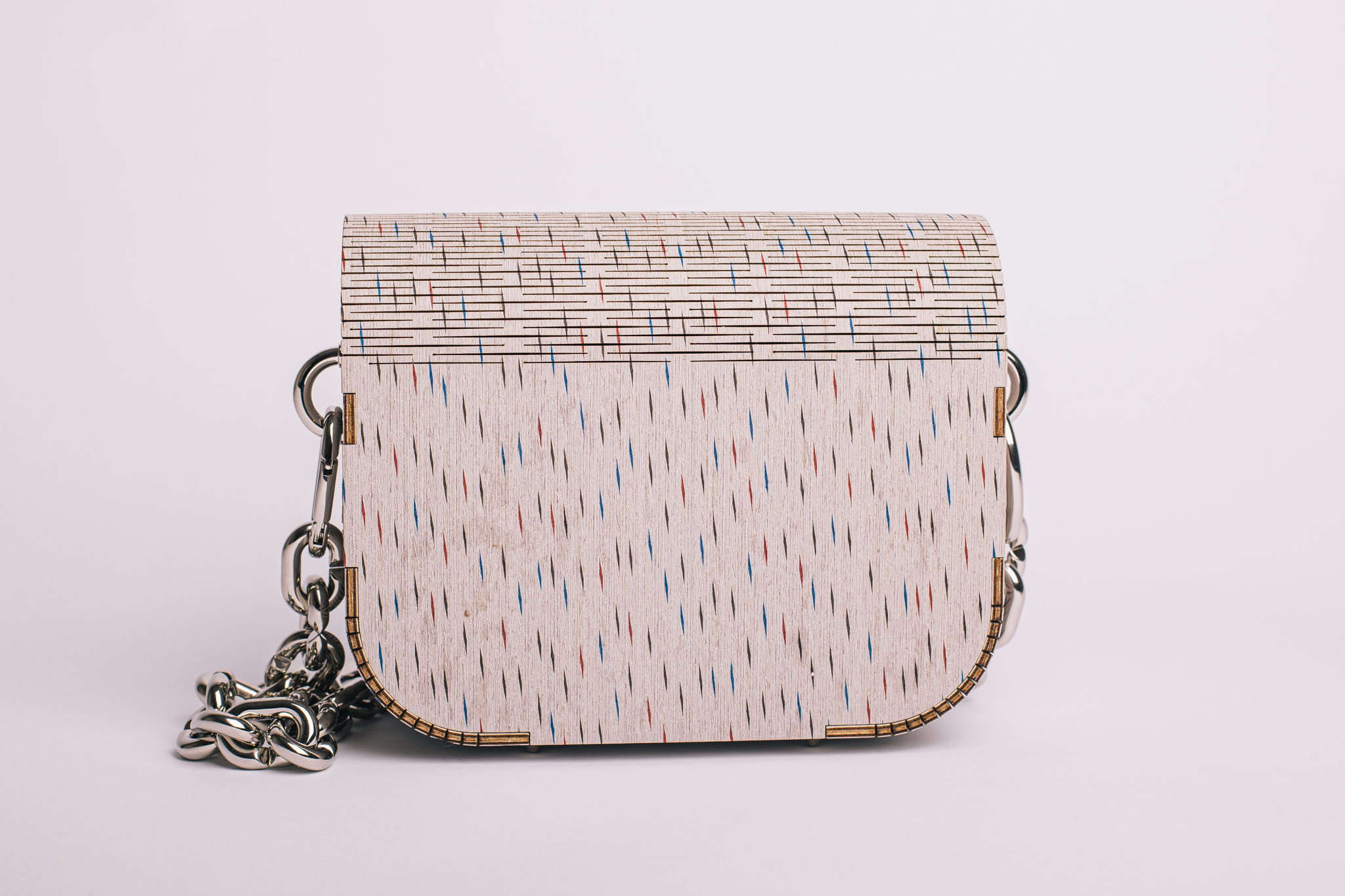 Semplice, neutra e soprattutto comoda. Si tratta di una borsa pensata per tutti i giorni, pratica da aprire e abbastanza capiente da poter contenere il necessario. Tutta la scocca e il rivestimento esterno รจ realizzato in legno, ciรฒ conferisce leggerezza, resistenza e rigiditร  alla borsa. Un dettaglio importante sono i tagli visibili che permettono di realizzare le parti curve della borsa.