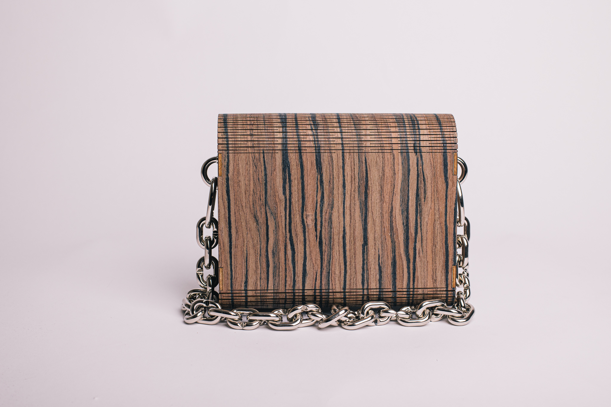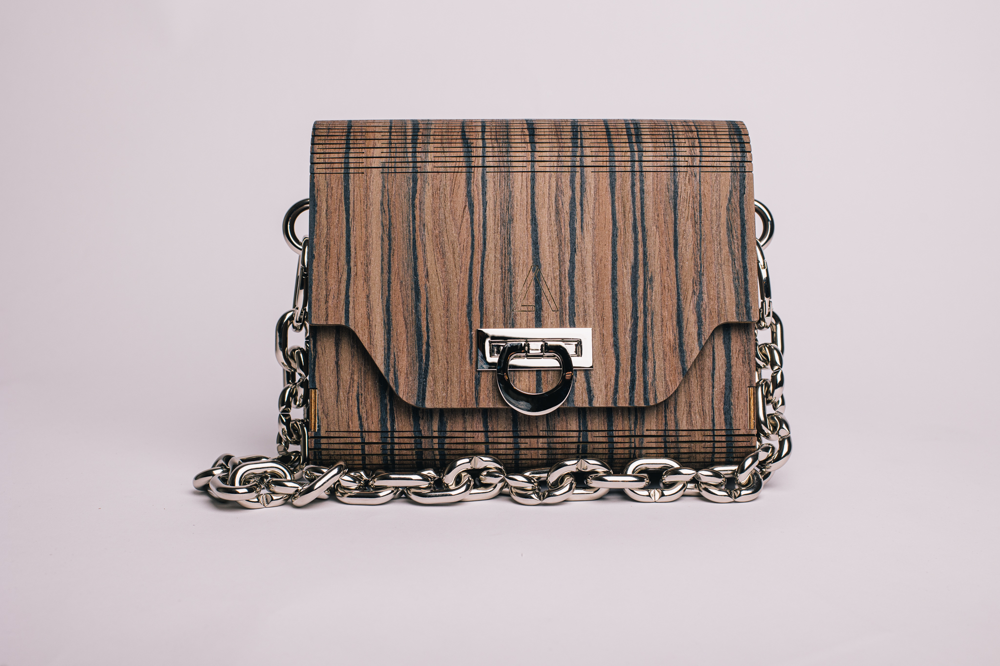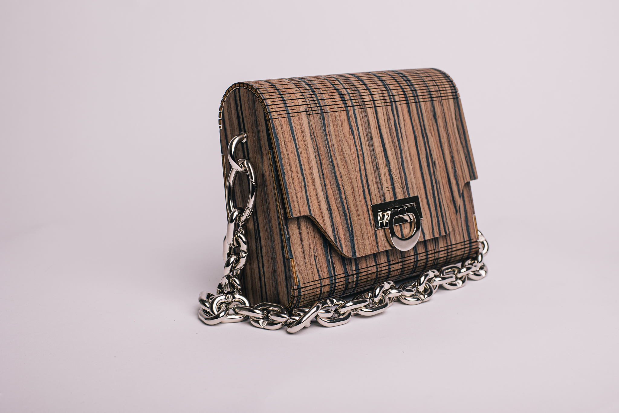 La particolaritร  di questo modello รจ la sua forma a trapezio, che le conferisce un look stravagante e la rende adatta per tutte le donne, รจ pratica da aprire, abbastanza capiente da poter contenere il necessario e comoda in quanto la parte frontale interna รจ ribassata. Tutta la scocca e il rivestimento esterno รจ realizzato in legno, ciรฒ conferisce leggerezza, resistenza e rigiditร  alla borsa. Un dettaglio importante sono i tagli visibili che permettono di realizzare le parti curve della borsa.