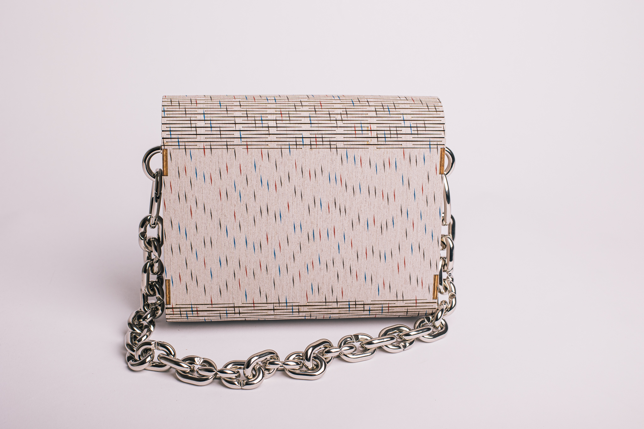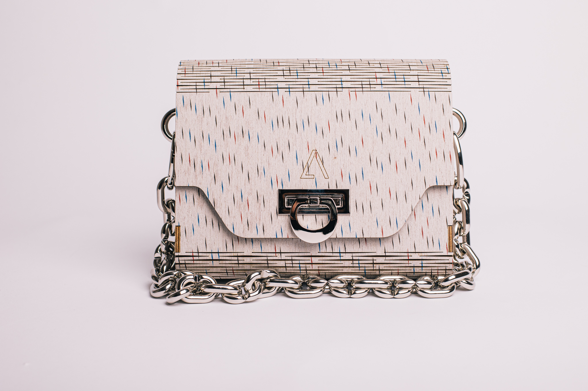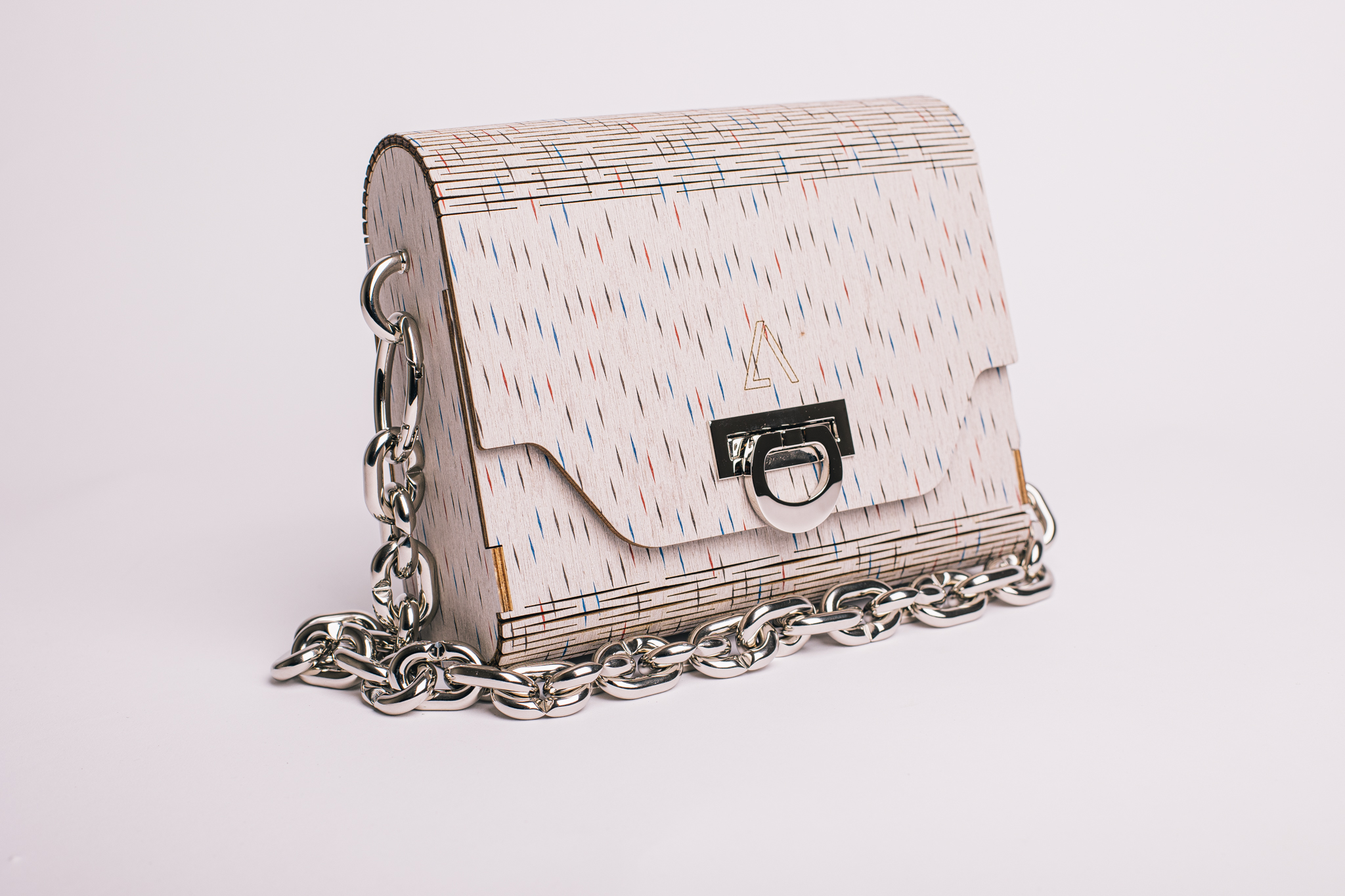 La particolaritร  di questo modello รจ la sua forma a trapezio, che le conferisce un look stravagante e la rende adatta per tutte le donne, รจ pratica da aprire, abbastanza capiente da poter contenere il necessario e comoda in quanto la parte frontale interna รจ ribassata. Tutta la scocca e il rivestimento esterno รจ realizzato in legno, ciรฒ conferisce leggerezza, resistenza e rigiditร  alla borsa. Un dettaglio importante sono i tagli visibili che permettono di realizzare le parti curve della borsa.