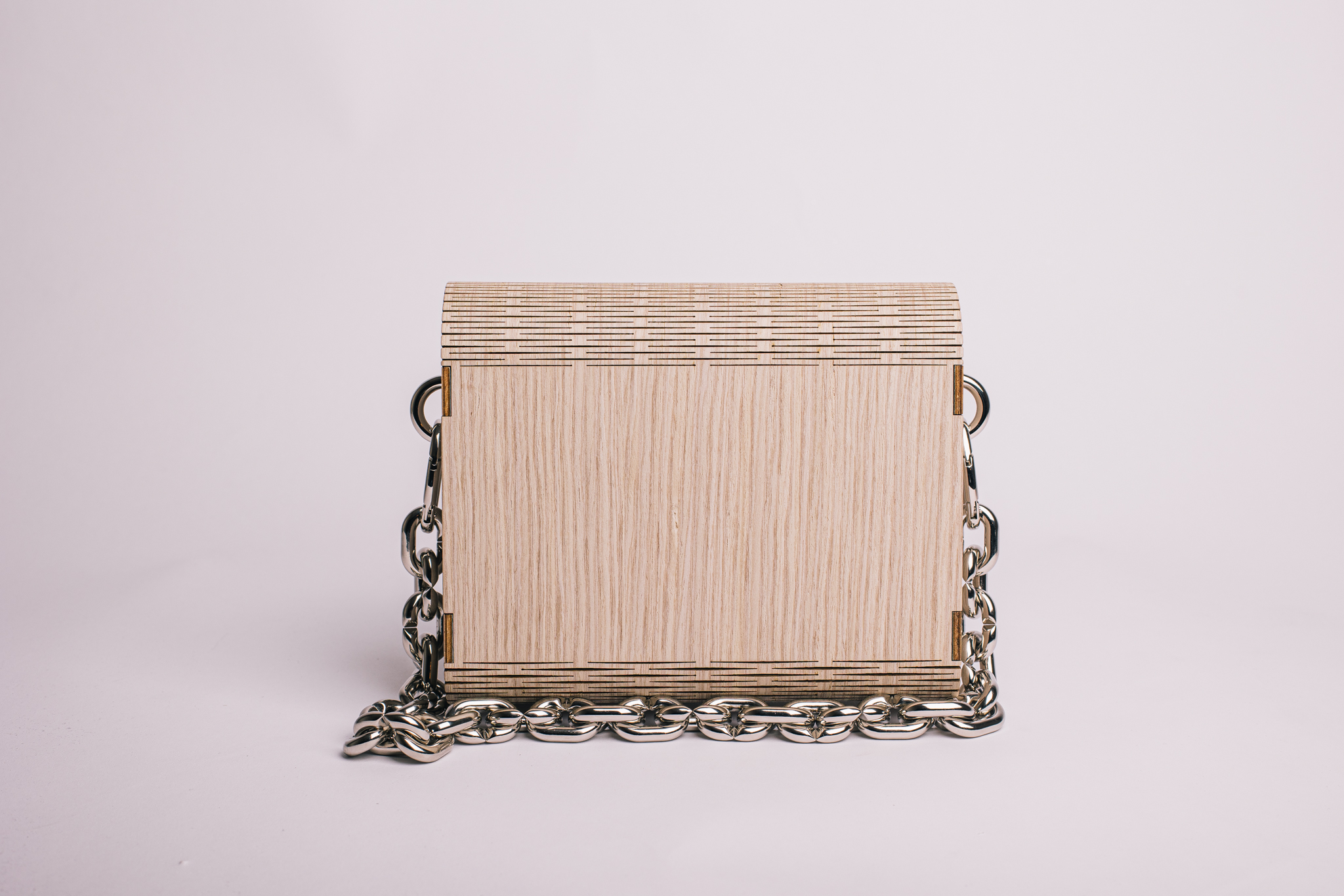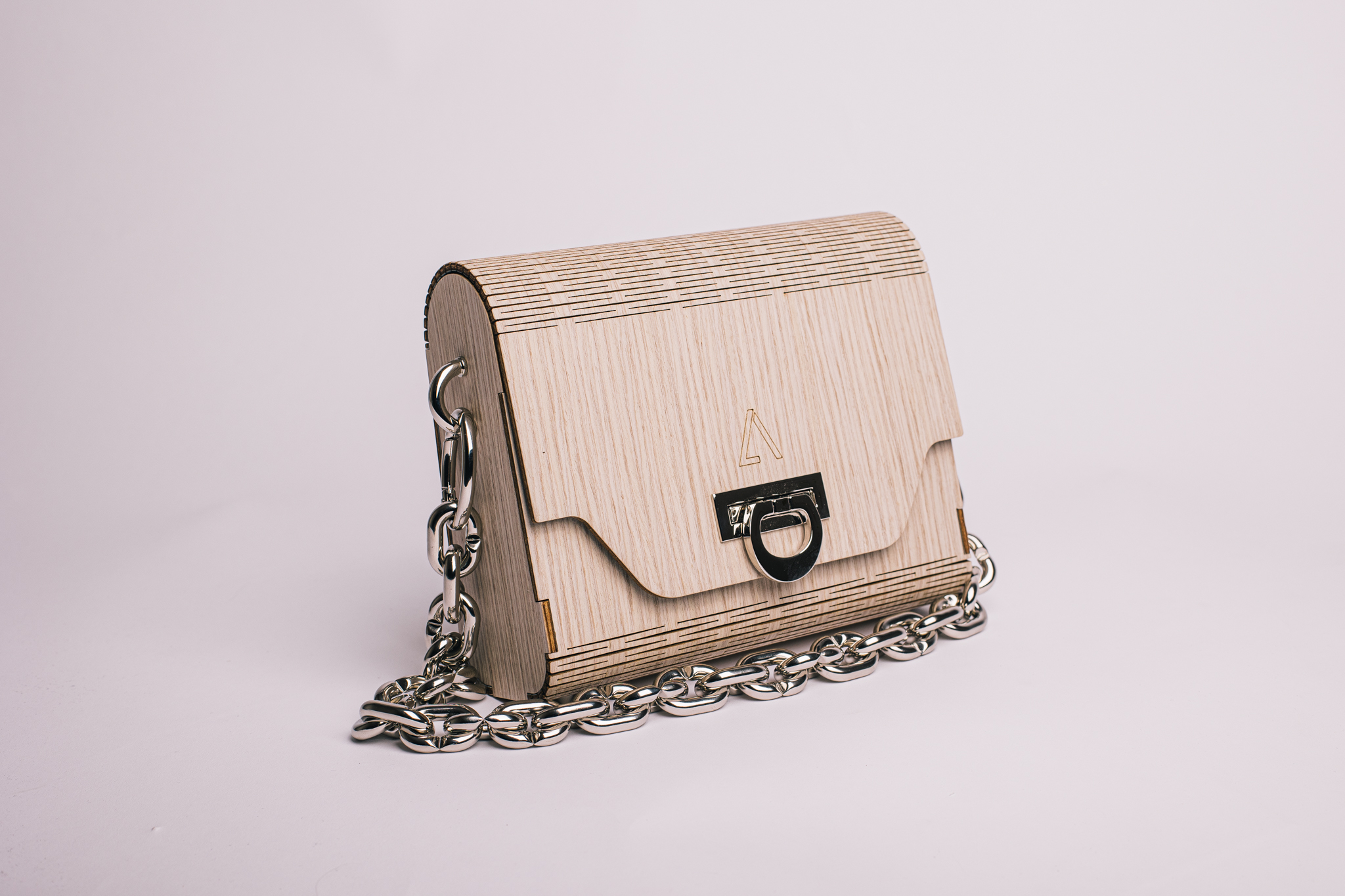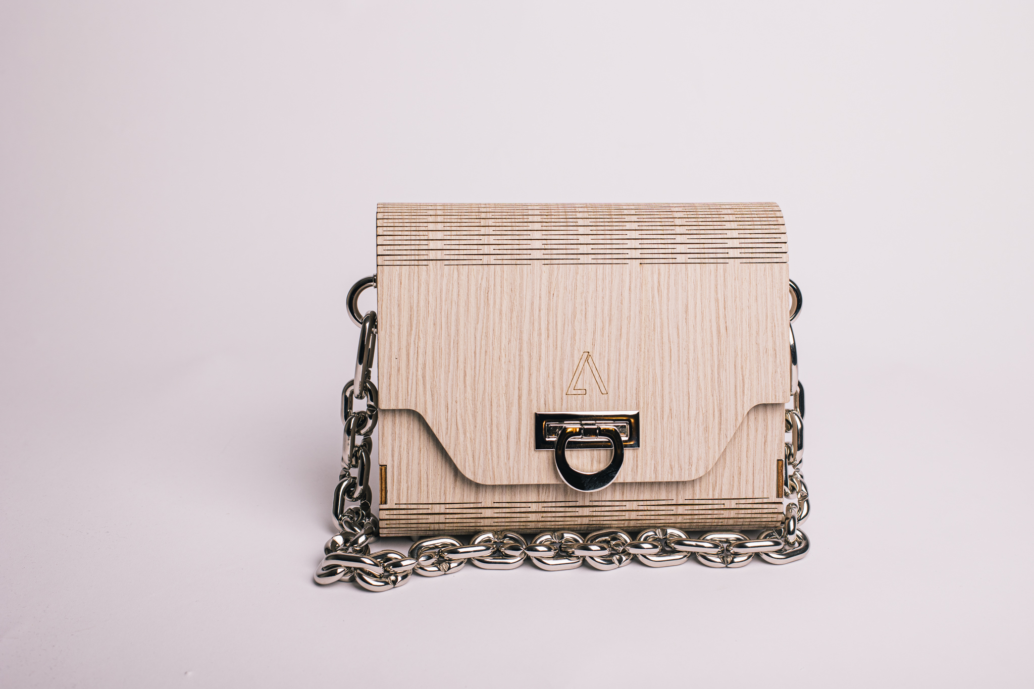 La particolaritร  di questo modello รจ la sua forma a trapezio, che le conferisce un look stravagante e la rende adatta per tutte le donne, รจ pratica da aprire, abbastanza capiente da poter contenere il necessario e comoda in quanto la parte frontale interna รจ ribassata. Tutta la scocca e il rivestimento esterno รจ realizzato in legno, ciรฒ conferisce leggerezza, resistenza e rigiditร  alla borsa. Un dettaglio importante sono i tagli visibili che permettono di realizzare le parti curve della borsa.